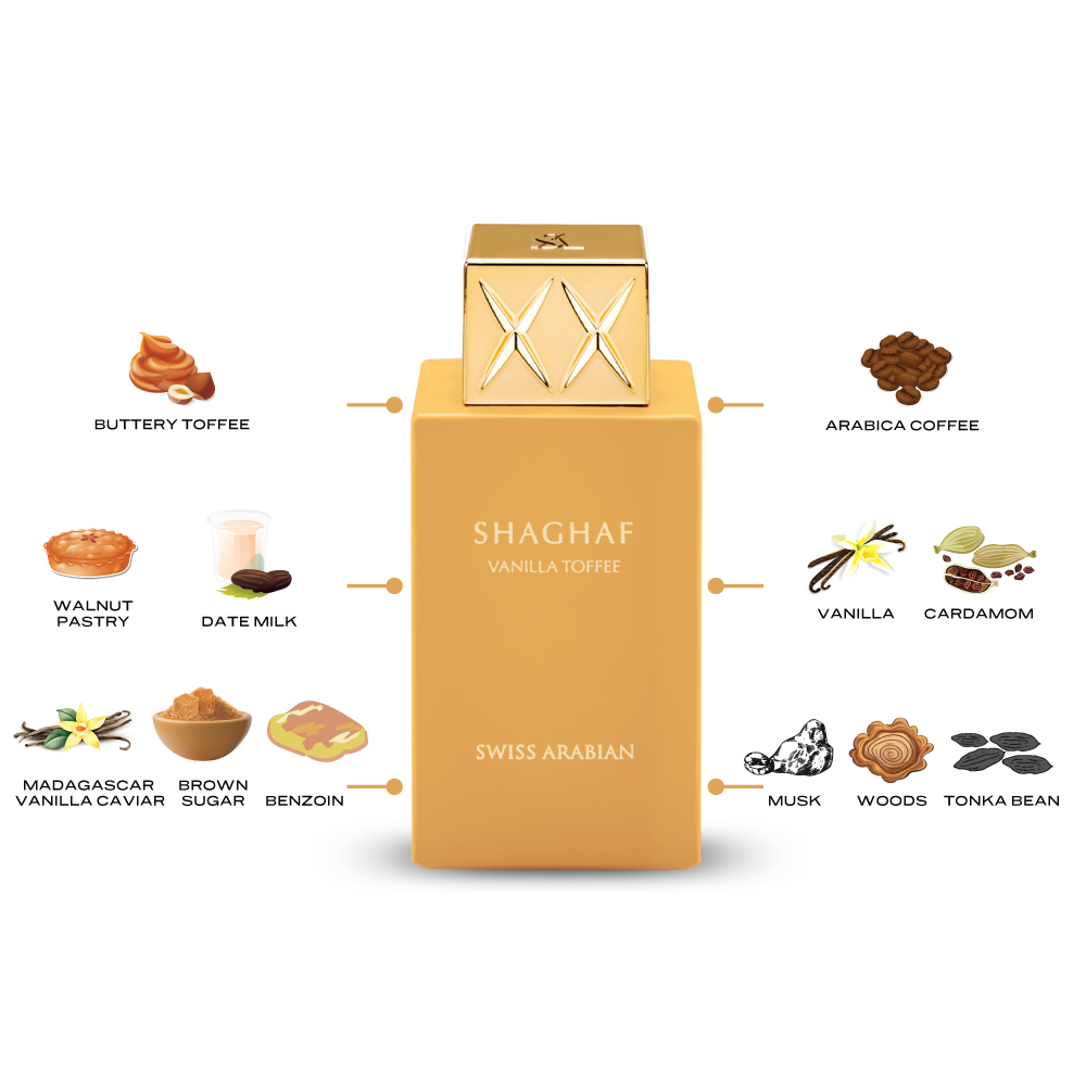 Shaghaf Vanilla Toffee unfolds with the decadent sweetness of buttery toffee and rich Arabica coffee. The heart reveals a delectable walnut pastry, reminiscent of the intricate layers of a Swiss Nusstorte. Creamy date milk envelops like a velvety indulgence, offering a sensation akin to the richness of the desert’s golden sunsets, while vanilla and cardamom add a sprinkle of exotic spice, whisking you away to distant, enchanted lands. Finally, the mysterious allure of warm and woody notes completes the journey with a seductive, sweet embrace.